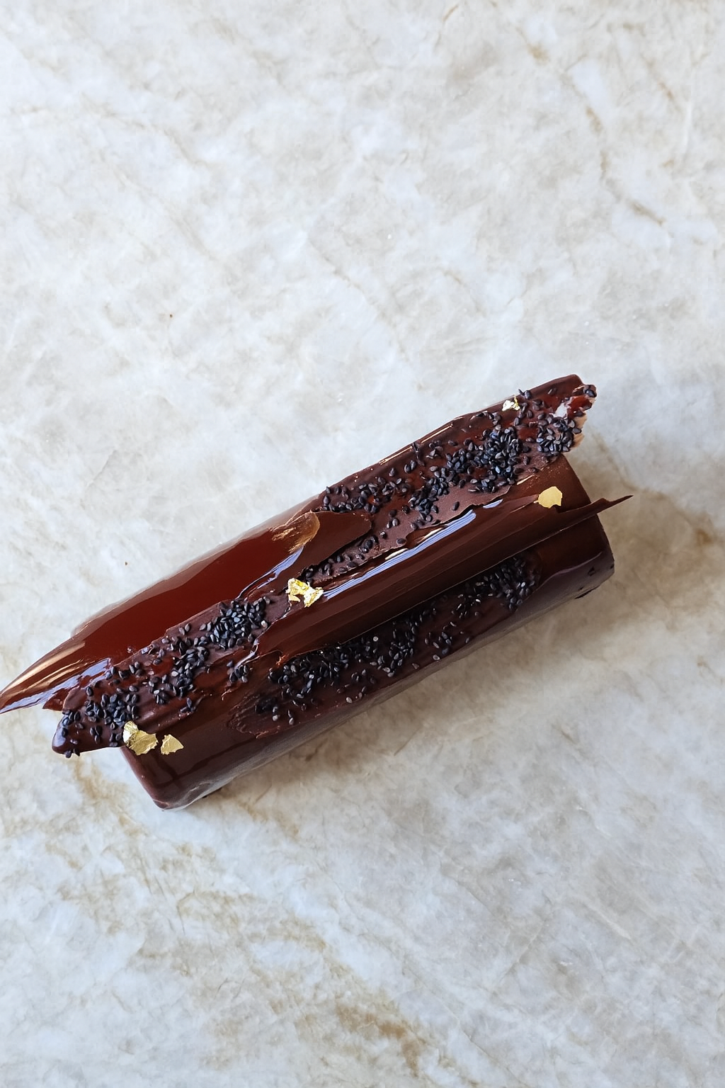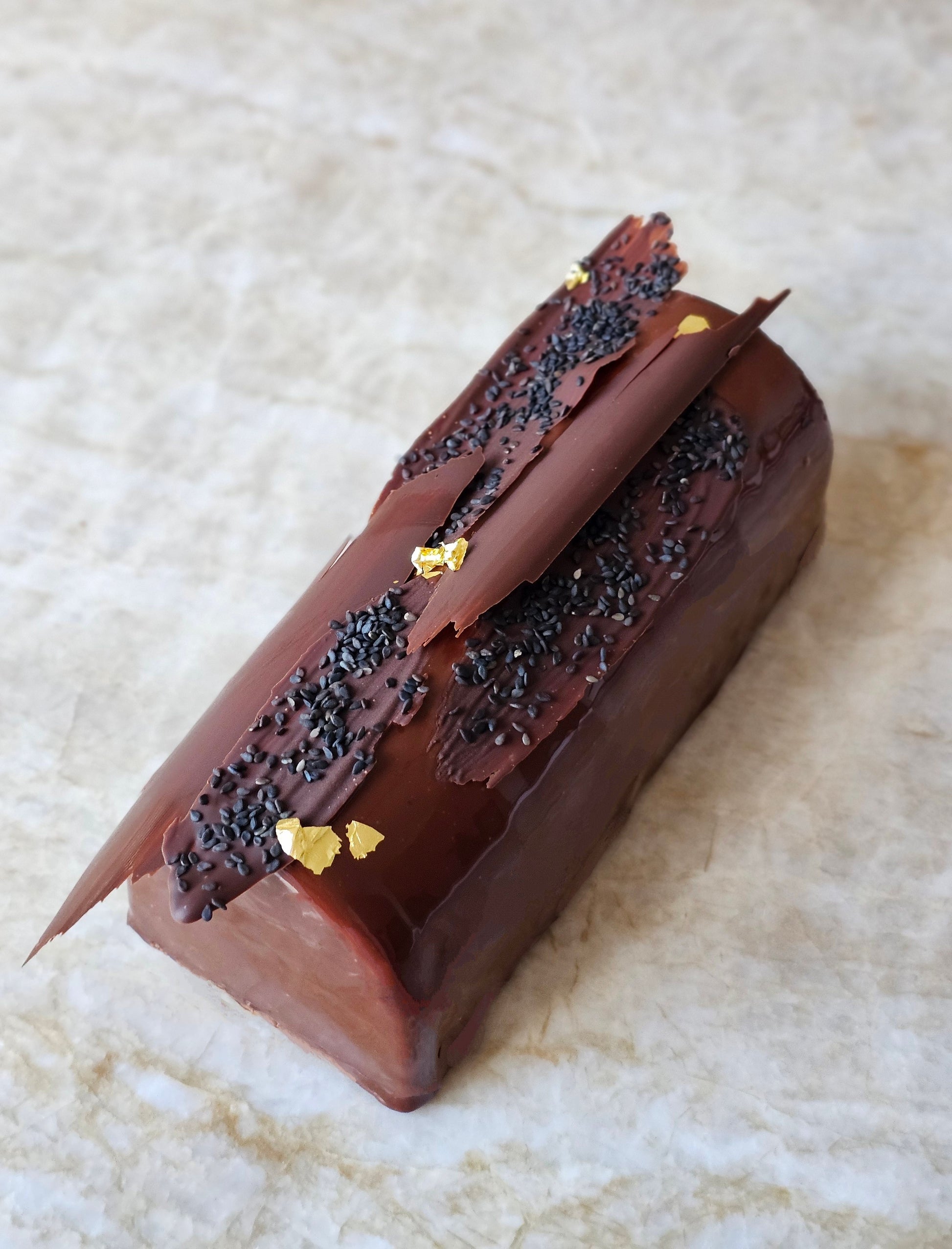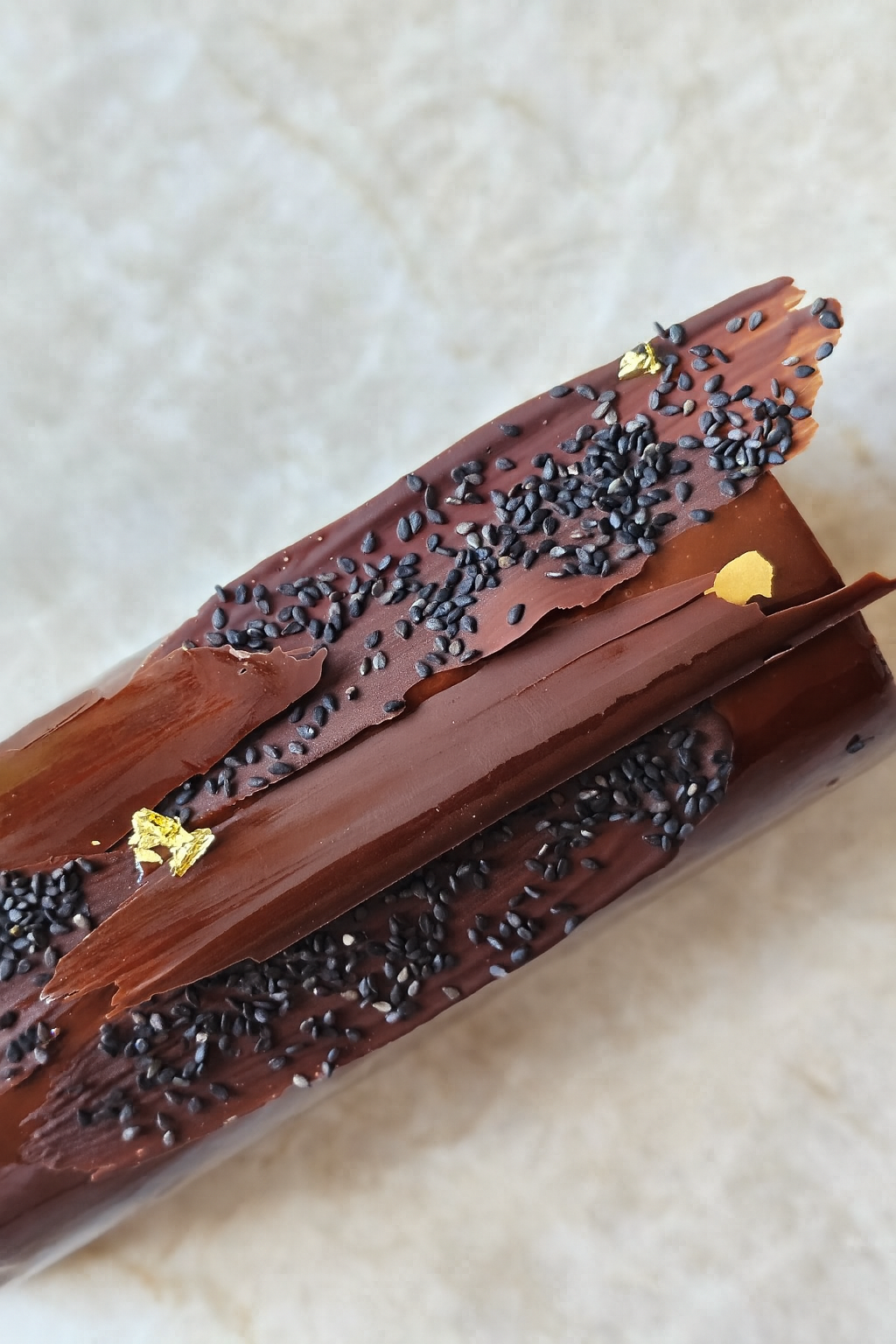 Pour cette deuxième bûche nous avons souhaité contrebalancer sa gourmandise avec sa décoration épurée, ressemblant au bois avec ses fines couches de chocolat tempéré avec et sans sésame, façon mendiant. Son glaçage au cacao brillant et ses feuilles d'or comestibles. Celle-ci ravira tous les gourmands, petits & grands... une association extra, gourmande et douce.